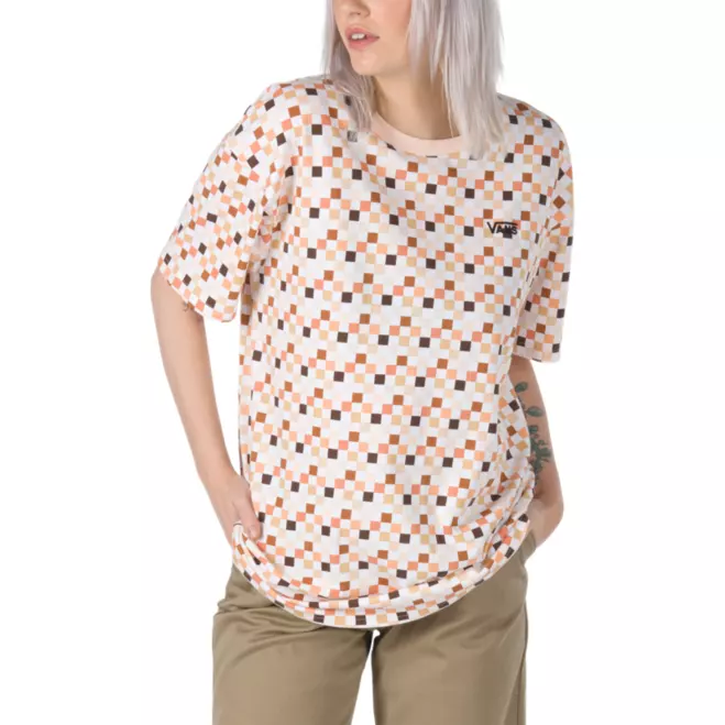 Featuring an allover checkerboard print, the Breast Cancer Awareness Oversized Tee is a heavy 100% cotton jersey oversized crewneck tee with short sleeves and embroidery at the chest. A minimum of $200,000 of the collection's proceeds will be donated to Coppa Feel!, a U K-based organization dedicated to educating young people on boob checking, the signs and symptoms of breast cancer, and empowering them to speak up when any changes are noticed. / Womens Breast Cancer Awareness Oversized Tee Shirt in Nude Check ( Ztt) / X- Small / 100% Cotton / Vans