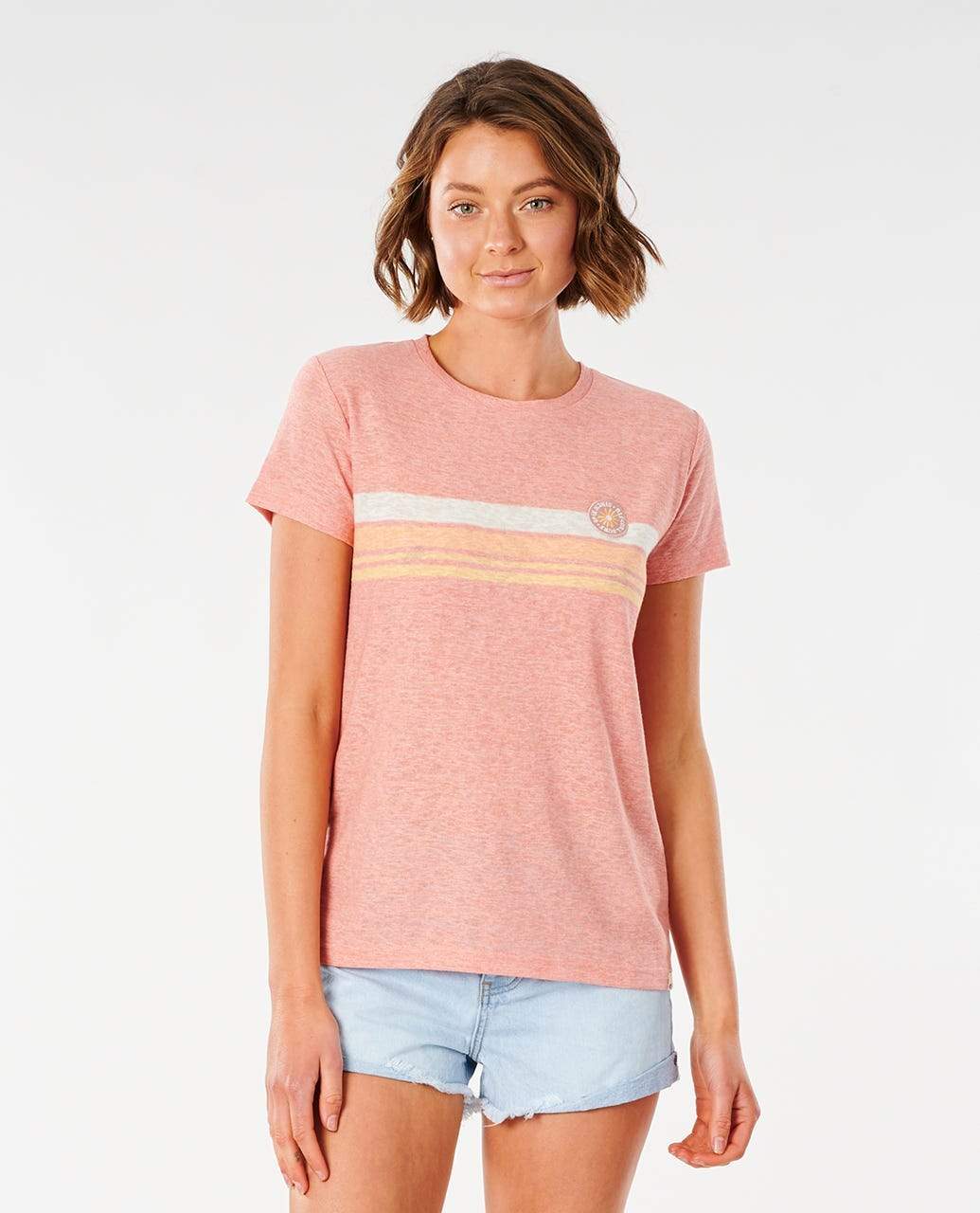 The Blossom Stripe Tee is a fun blend of pastels and stripey patterns. The tee has a textured jersey look and feel with a branded chest patch detail. Standard fit Textured slub jersey Yarn dye stripe Chest patch Branded trims Cotton/ Poly Slub Jersey / Womens Shirt Blossom Stripe in Clay (0136) / X- Small / Cotton / Rip Curl