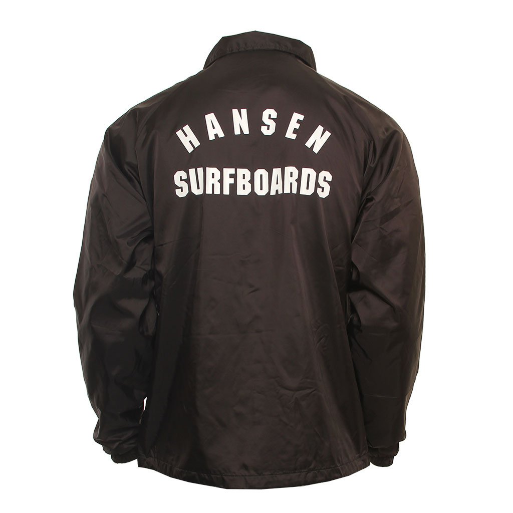 The Hansen Surfboards Coaches Jacket is an updated version of our original Coaches Jacket from the 60s that hangs in Dons office. Since we are celebrating our 60th year in business we wanted to bring these back for a new generation to enjoy. This jacket features a front and back screen print and hass a 100% Nylon Shell and 100% Polyester Fill. / Surfboards Coaches Jacket in Black / Small / Polyester/ Nylon / Hansen