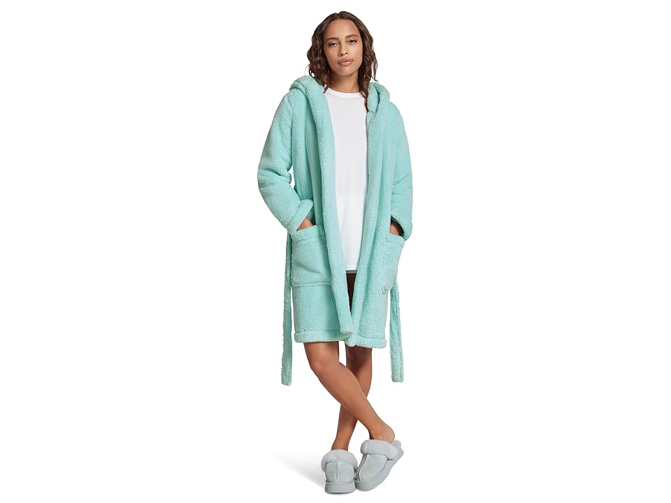 The UGG Australia Aarti Robe offers a layer of cozy warmth for chilly mornings. Featuring front patch pockets and a self-belt, it pairs perfectly with loungewear essentials and your favorite slippers. Hooded sherpa robe with soft belt. Tonal UGG embroidery on pocket. Roomy front patch pockets. Fabric has super soft and cozy feel. 100% polyester. Machine wash, tumble dry. Imported.