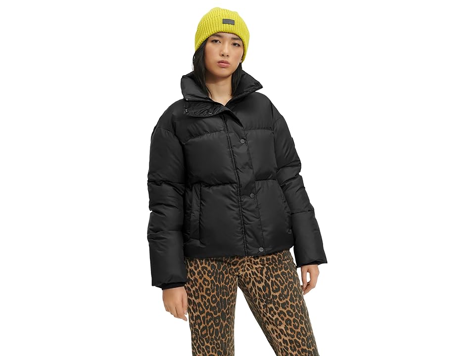 Get extra layer of warmth for comfortable living wearing UGG Vickie Puffer Jacket. Regular fit. Water resistant material passes aatcc35 rain test. Zip front stand collar. Snap center front placket with metal zipper closure. Long sleeves. Rib knit cuffs with thumbholes. Side welt pockets with snaps. Hip-length puffer jacket. UGG logo patch. Fabric: Shell: 100% nylon; Lining: 100% polyester; Fill: Synthetic down fill (polyester); Soft fleece hand warmer pocket linings. Machine wash cold; tumble dry low. Imported.