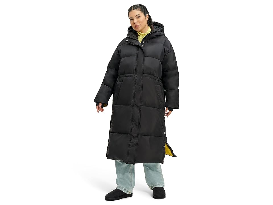 The UGG Keeley Long Puffer Coat is a soft and plush layer with attached hood for a comfy and warm wear. Water-resistant material passes aatcc35 rain test-rain or snow will stick to or wet the fabric. Sherpa lined hood. Synthetic down fill polyester. Snap closure at side seams for wider entry. Rib knit storm cuffs with thumbholes. Zippered full closure with snap placket. Welt pockets. Soft fleece with handwarmer pocket linings. Internal chest pocket with snap closure. Internal bungee cord at waistband to allow cinching. UGG logo patch logo included. Shell: 100% polyester; Lining: 100% polyester. Machine wash, tumble dry. Imported.