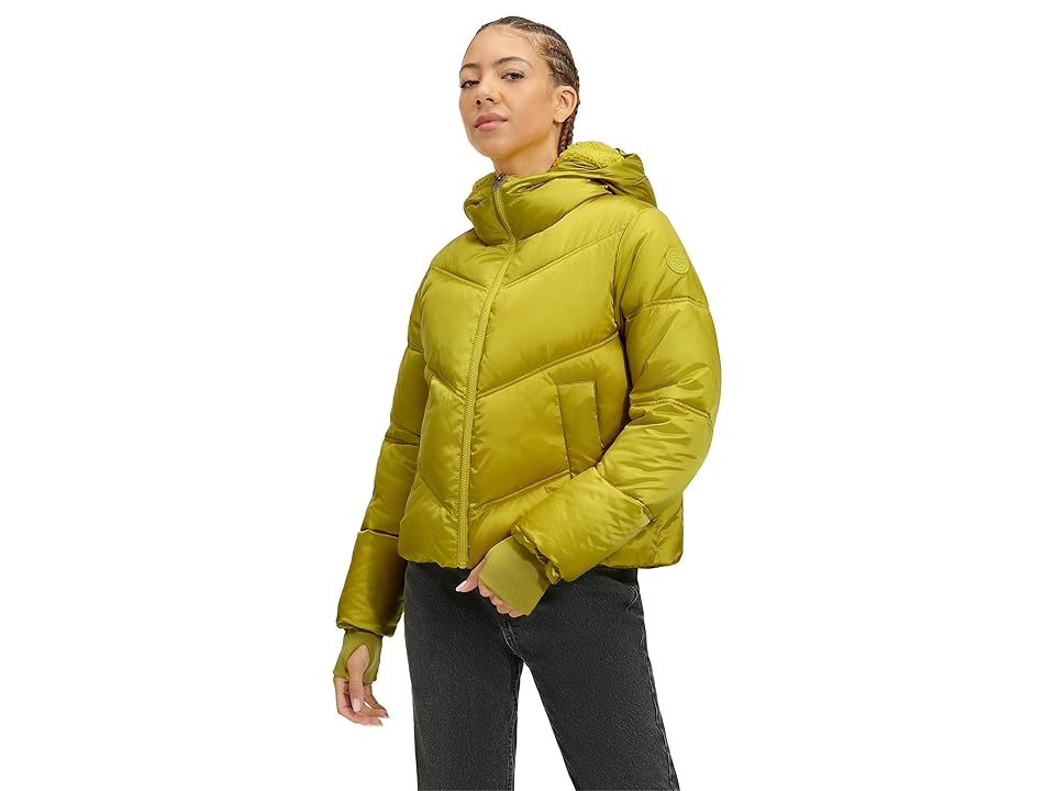 Keep yourself warm wearing the versatile UGG Ronney Cropped Puffer Jacket. Side welt pocket with snap closure. Rib-knit cuffs with thumbholes. UGG logo patch on the jacket. Zippered front closure. Intended to hit at the waist. 100% nylon; Lining: 100% polyester; Hood lining: 100% polyester; Shell: 100% nylon. Machine wash, tumble dry. Imported.
