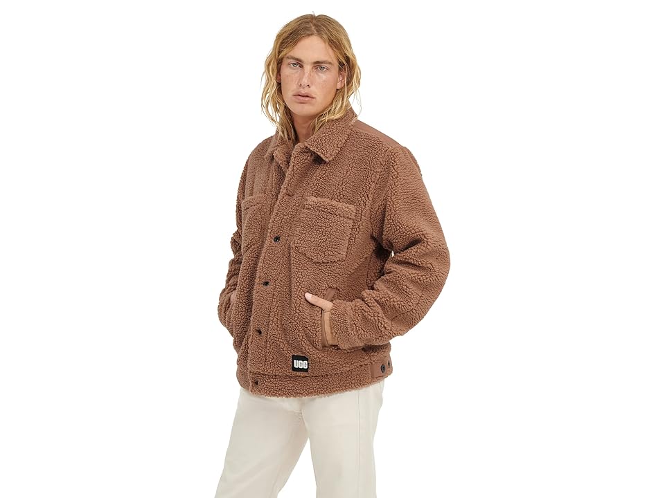 Keep it simple and elegant wearing the UGG Janson Sherpa Trucker Jacket. Collared neckline and long sleeves. Two side pockets. Two chest pockets with flap closure on the front. Nylon yoke and under collar design. Buttoned front closure. Adjustable tabs on back waistband. Side pockets with soft fleece design. Hand warmer pockets with lining. UGG graphic woven label. Self: 100% polyester; Lining: 100% polyester. Dry-clean. Imported.