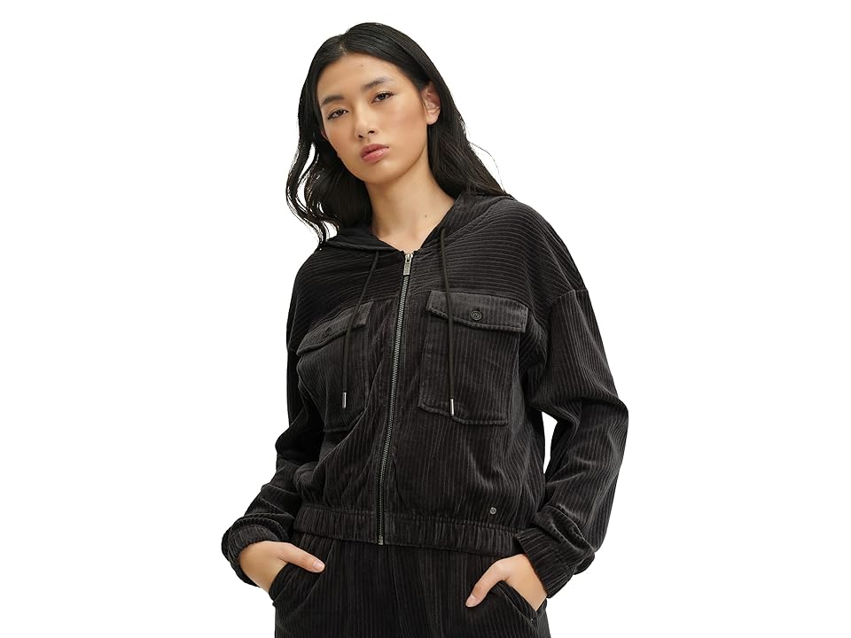 Keep it subtle and stay comfy wearing the UGG Julissa Knit Courduoy Bomber Jacket. Attached hood and long sleeves. Zippered front closure. Two chest pockets with flap closure. Elasticized waistband and cuffs. Two side pockets. UGG logo design on the center back. Self: 100% cotton; Lining (hood yoke): 100% cotton jersey; Drawcord: 100% cotton. Machine washable. Imported.