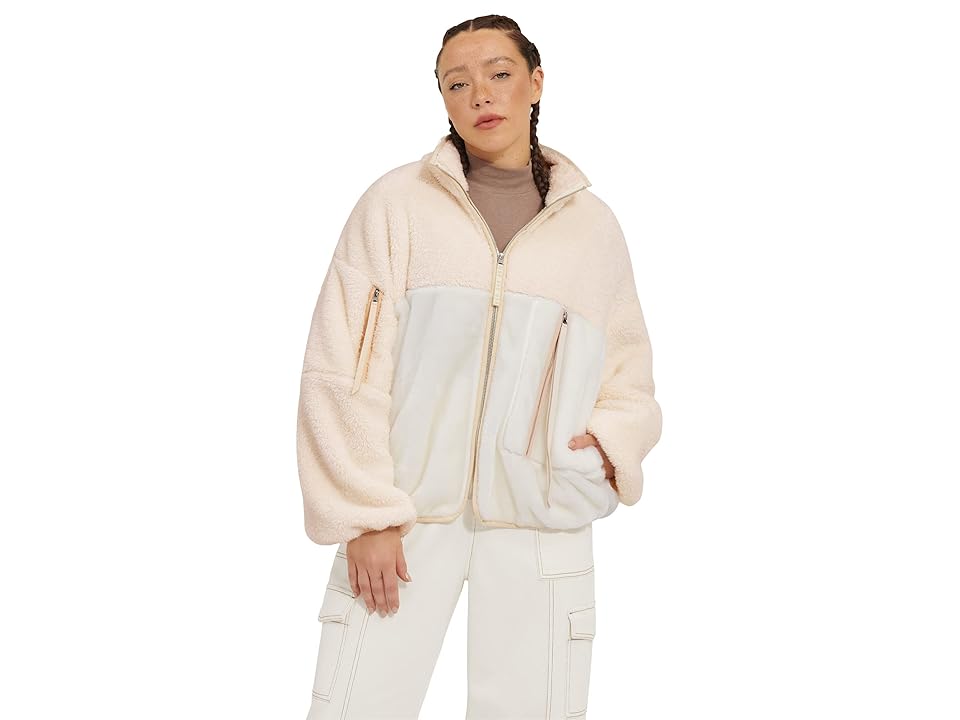 Feel the snuggly pampered warmth wearing UGG Marlene Sherpa Jacket II. Relaxed fit. Stand collar. Full-zip closure. Long sleeves. Pockets: Front zipper pocket. Arm zipper pocket. UGG graphic exaggerated embossed faux suede zipper pull. Pop color knit binding along center front closure, hem, pocket zipper plackets, and cuffs. Fabric: Body: 100% polyester; Lining: 100% cotton. Machine wash, tumble dry. Imported.