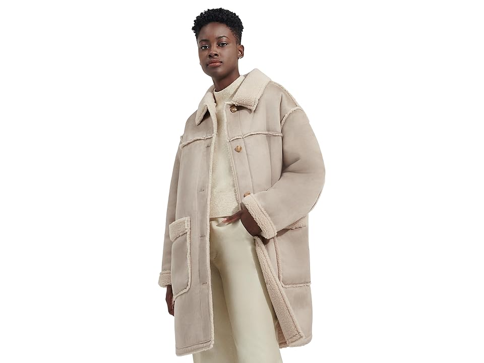 Featuring a spread collared neckline and long sleeves, the UGG Takara Luxefluff Mid Jacket comes with two patch pockets on the front. The buttoned front closure ensures a secure fit. Add this jacket to your collection. Faux horn shell buttons. Faux Shearling exposed trim and patch pockets. Intended to hit at the thighs. Curved hem. Main: 100% polyester; Self: 100% polyester; Lining: Unlined. Machine wash, tumble dry. Imported.