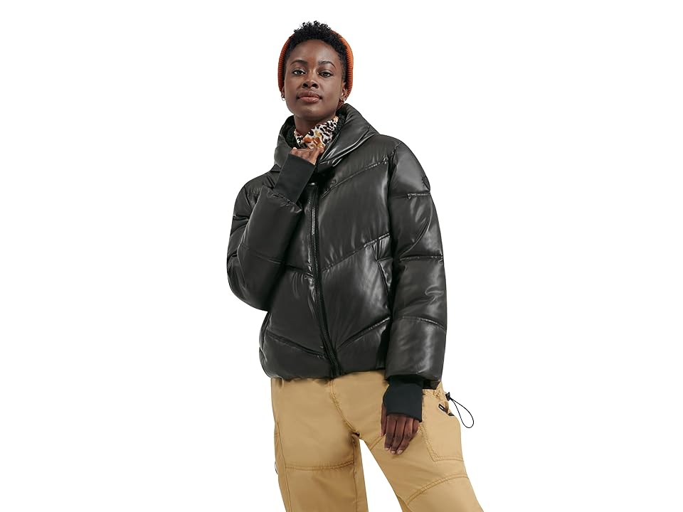 Stay warm in style with the bold UGG Ronney Puffer Faux Leather jacket. Hooded mock collar. Long sleeves with fitted ribbed knit cuffs. Cuffs contain thumbhole. Quilt stitch design. Center front zipper closure. Straight hemline. 100% polyester. Imported.