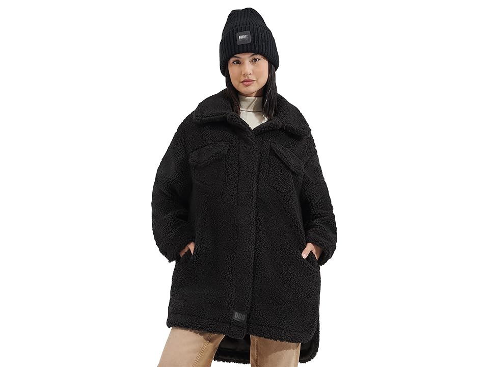 The primary materials that compose this product contain a minimum of 20 percent recycled content. A plush fleece trucker jacket, the UGG Frankie Uggfluff Shirt Jacket comes with two patch pockets on the front, and two side pockets. The collared neckline complements the buttoned front closure, offering a secure fit. Add this jacket to your collection. UGG graphic snaps on the front. 100% recycled polyester. Machine wash, lay flat to dry. Imported.