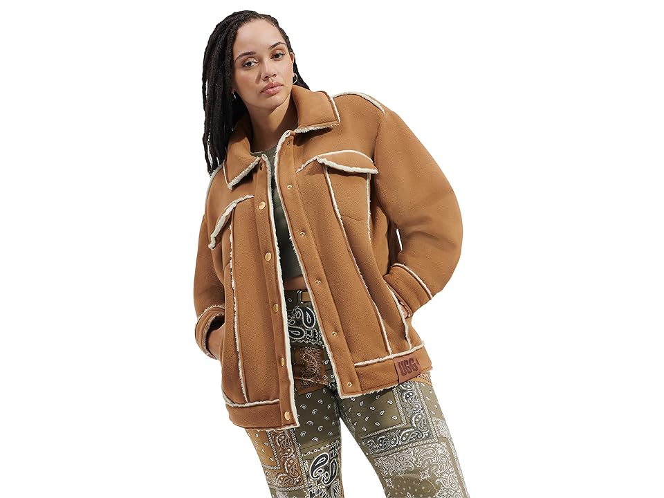 The primary materials that compose this product contain a minimum of 20 percent recycled content. A part of the special collection, the UGG Frankie Bonded Fleece Trucker Jacket keeps you warm and comfy in the cold weather. This jacket has a spread collared neckline and long sleeves which complement the vhest pockets with flap and hidden snap closure, offering a secure fit. Buttoned front closure. Two front patch pockets with buttoned closure. UGG Graphic detailing on the front. Self: 100% recycled polyester; Lining: Unlined. Machine wash, tumble dry. Imported.