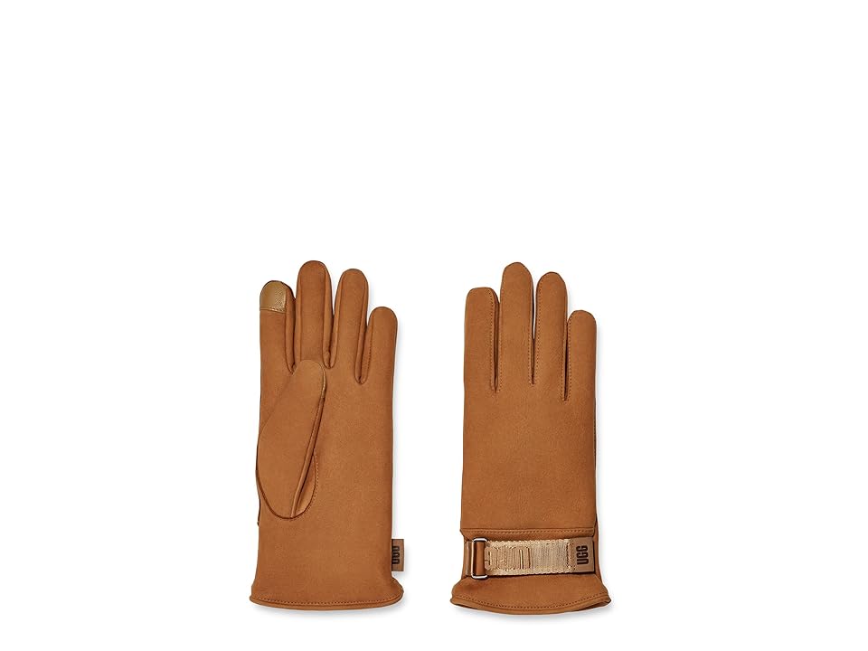 The primary materials that compose this product contain a minimum of 20 percent recycled content. Stay comfy wearing the UGG Logo Leather Smart Gloves with Conductive Tips and Recycled Microfur Lining. With a buckle closure on the strap, these gloves offer a secure fit. The conductive design helps keep you warm in cold weather conditions. The conductive leather on the palm helps you use your phone easily. Leather pull tab. Shell: 100% leather; Lining: 100% polyester. Machine washable. Imported.