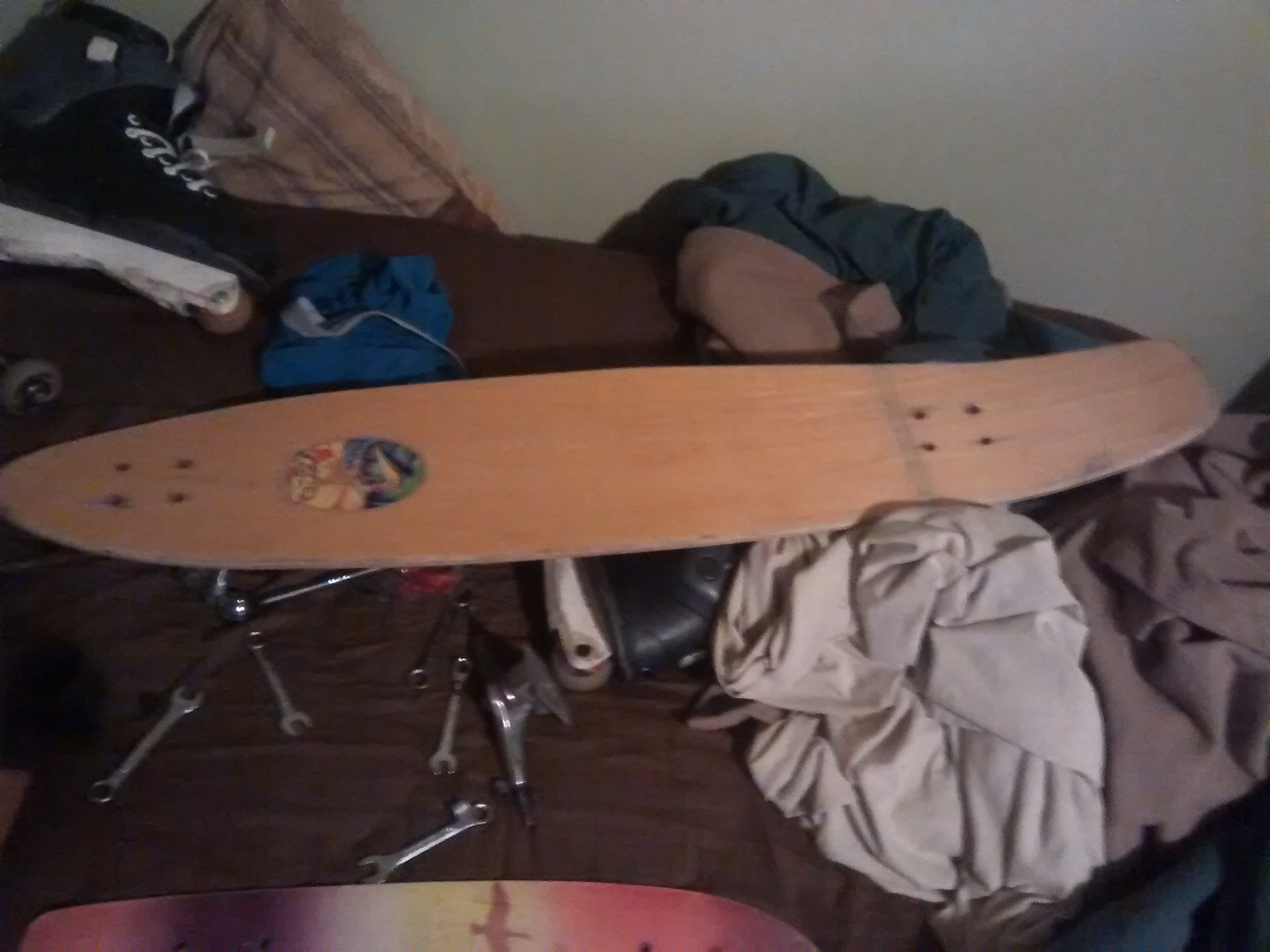 [url]So I found a board today at goodwill for a few bucks. I noticed its a little different than regular long board. It has the shape of a surfboard with a upward curved tip and the end. I heard they made skateboards a while back. It's seen better days, but I'm restoring it.