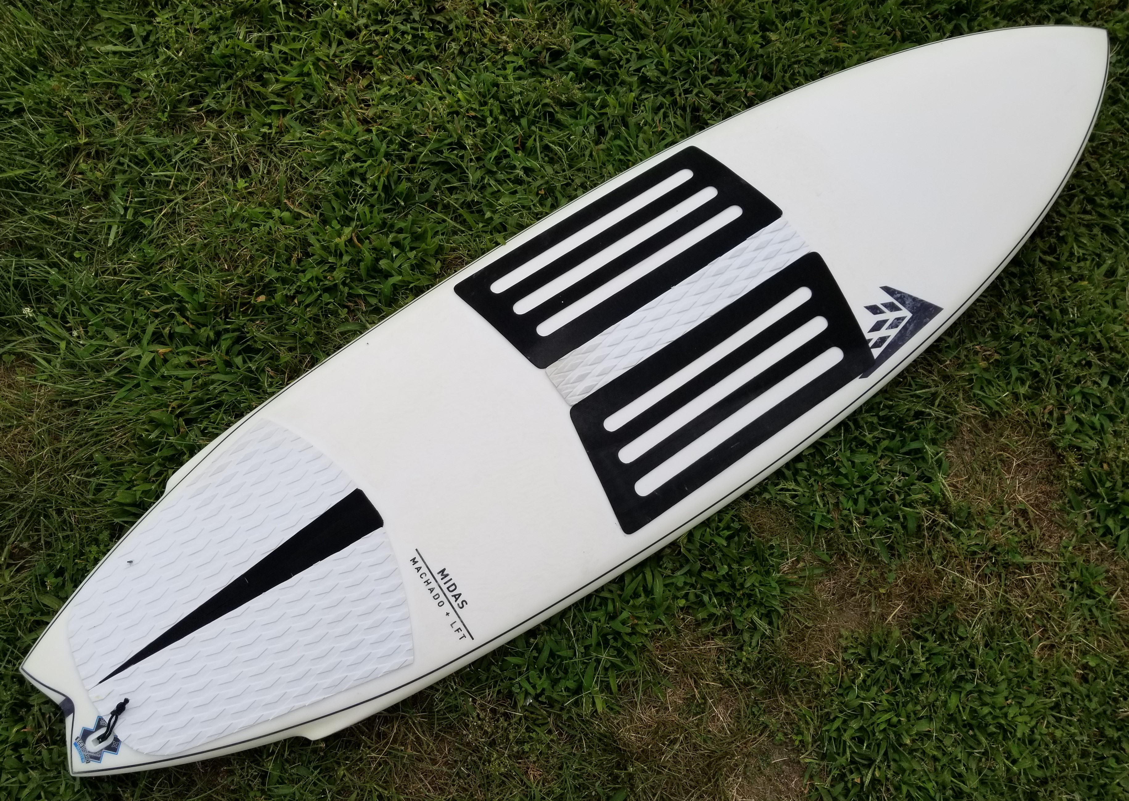 My step up is a Firewire Midas in LFT 6’3” x 21-3/16” x 2-11/16” (40.1L). I love all the different design era's that Machado combined into this board. The Fluted Wings on the wide tail block were inspired from the 1980 MR Twin Fin and the Edge Bottom underneath was taken from a 1970's Greenough design that he calls his Board Eat Board design.