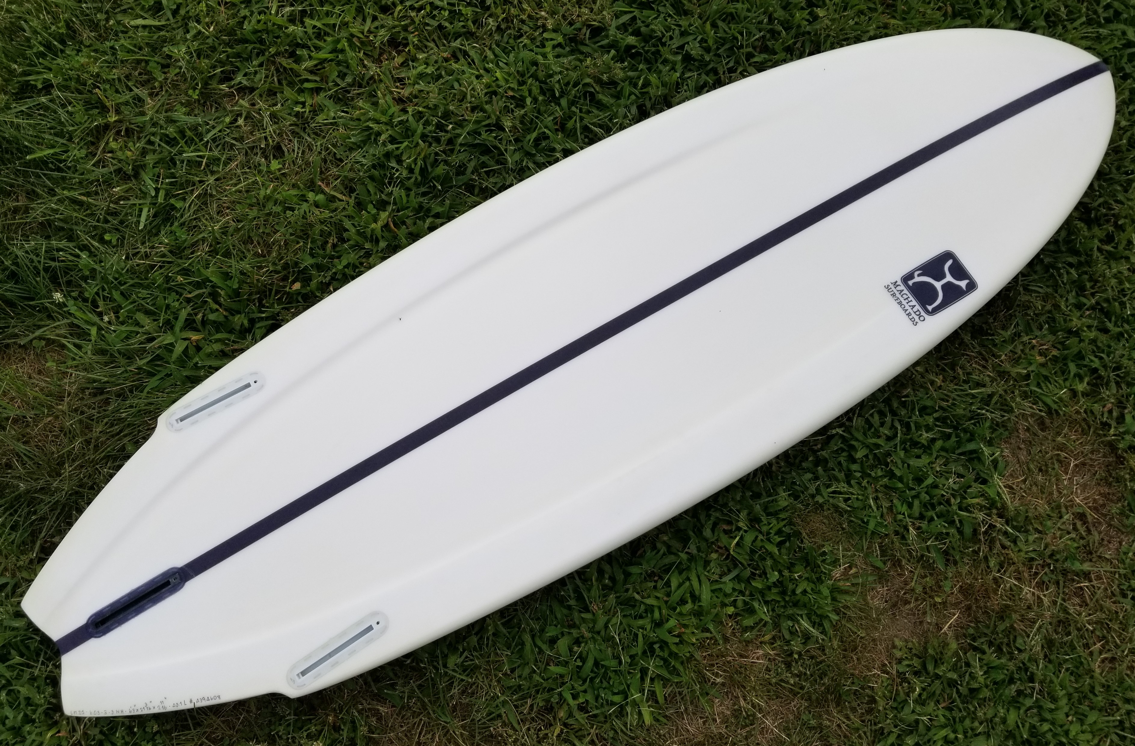 It glides almost like a hydroplane in bigger waves and still holds an edge like a much shorter board would. It uses smaller fins than usual because of the big edge around the planning hull... the edge almost acts like a fin of its own.