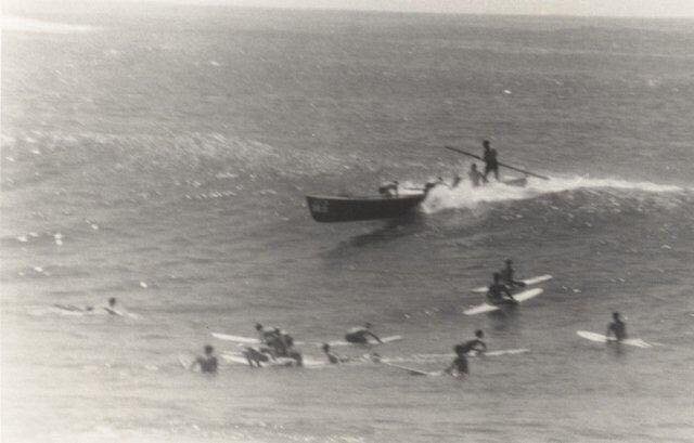 This picture above is of a noted big wave location in Sydney Australia , Fairy Bower , this was an early sixties crowd at medium size witha Surf Boat on the wave, think super SUPS with flailing oars and sweep oars and