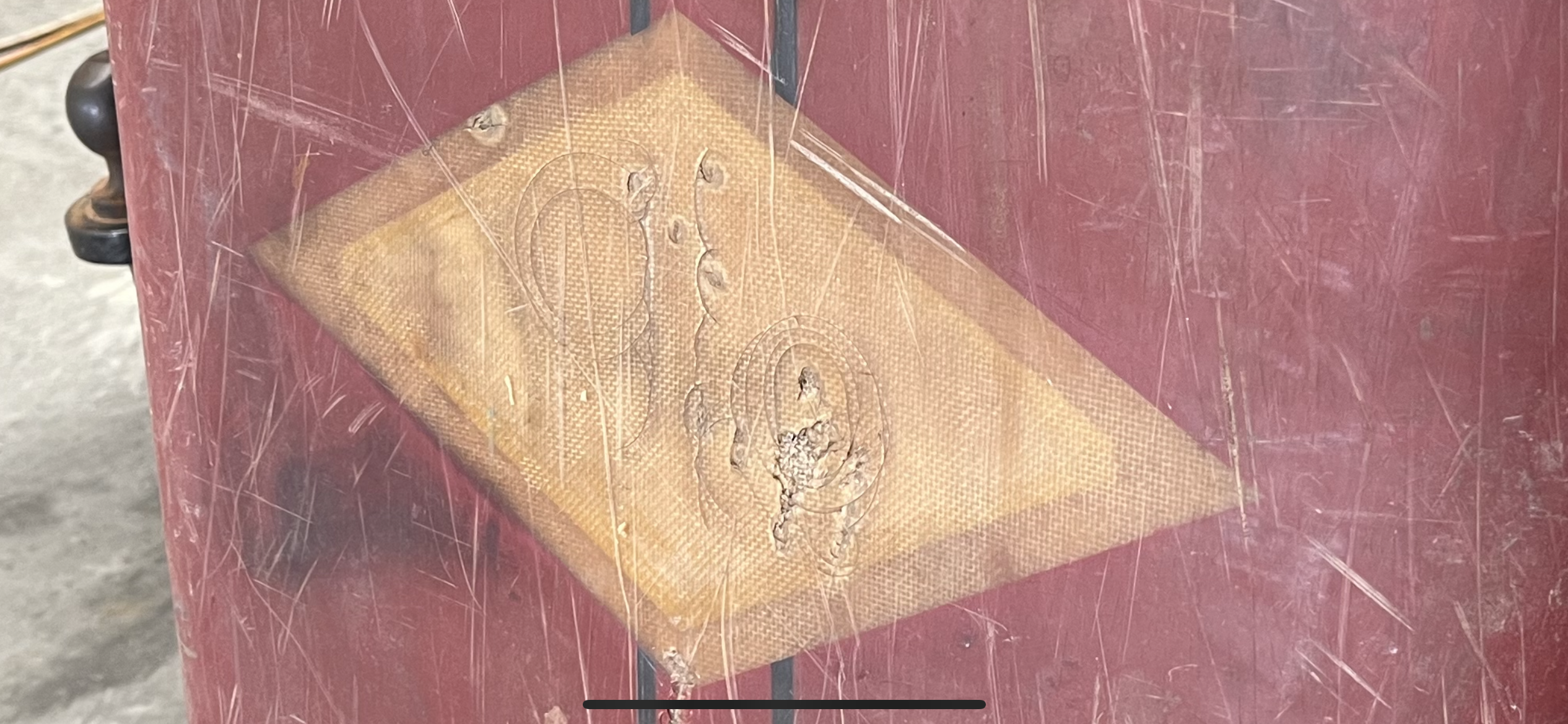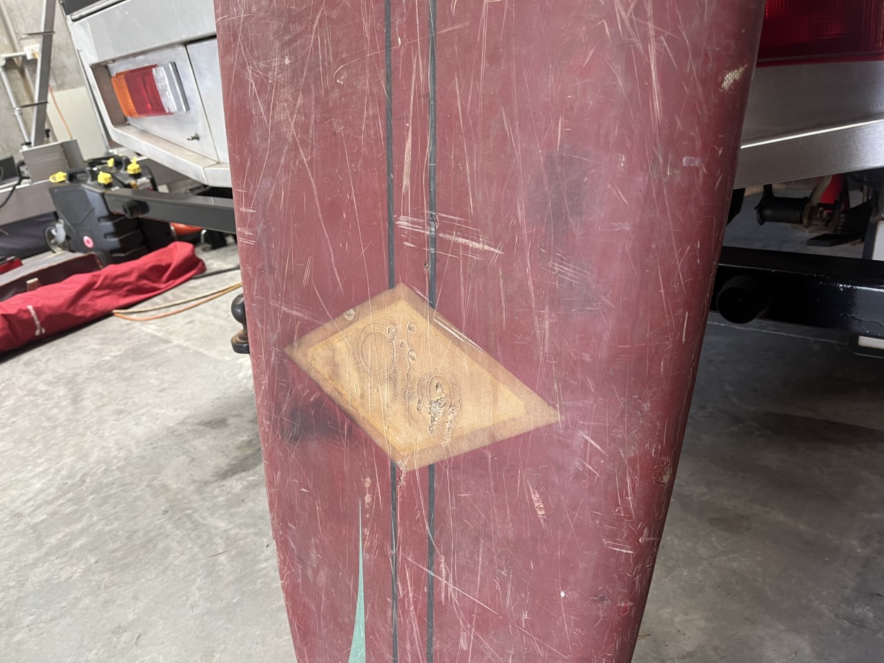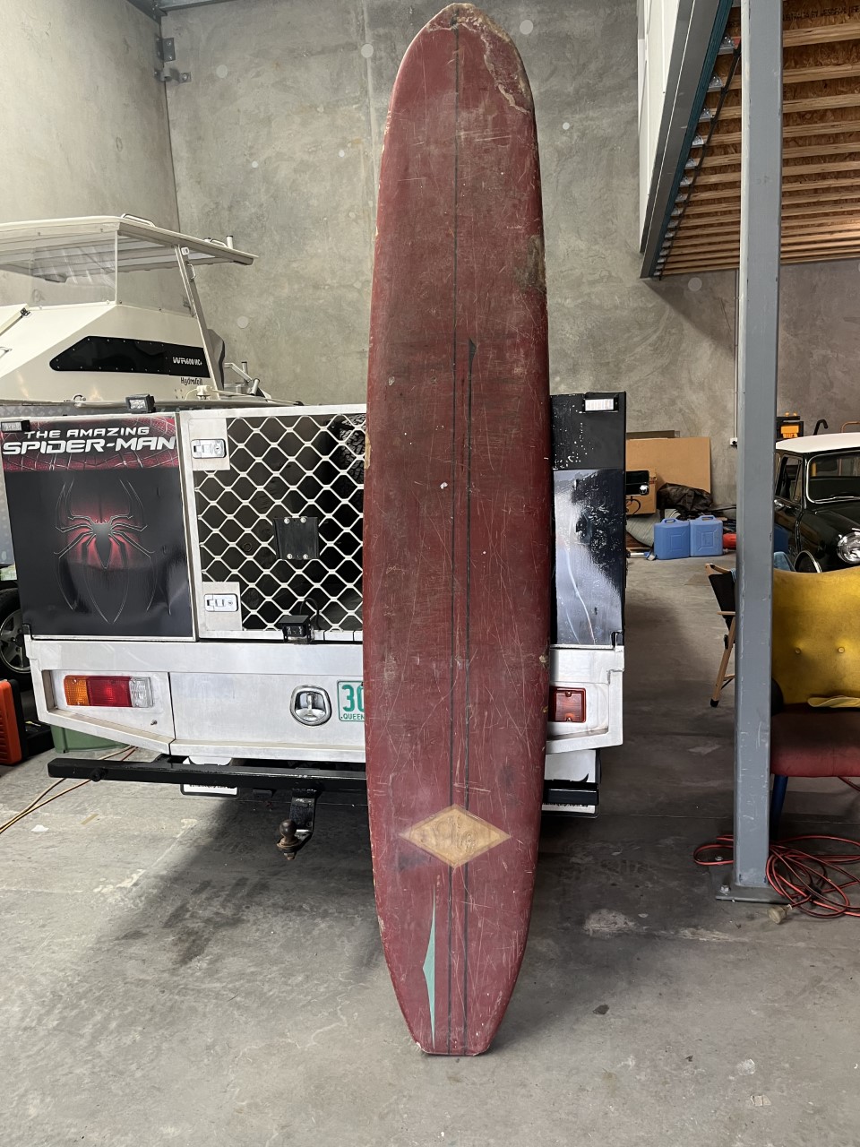 Think it has been recoated at some point and lots of damage. It is the logo that has me intrigued. Almost impossible to read - symmetrical diamond with a border. Looks like this area was clear coated when refinished. 9'4".