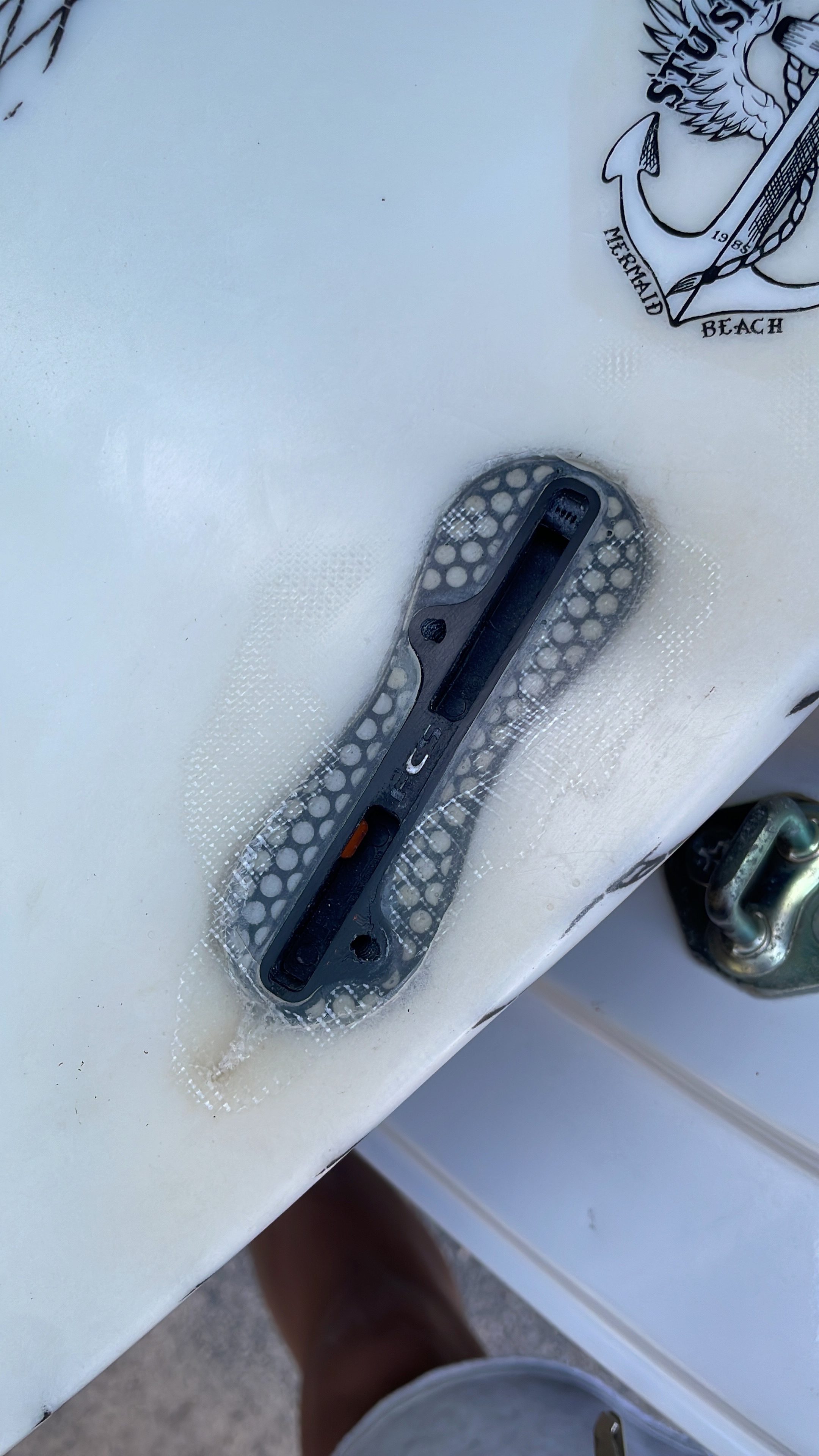 Being that it is FCS2, taking on and off the fin will increase that crack even more, since it has not been repaired properly ( or he bottom out on the reef again after he got it repaired the first time )