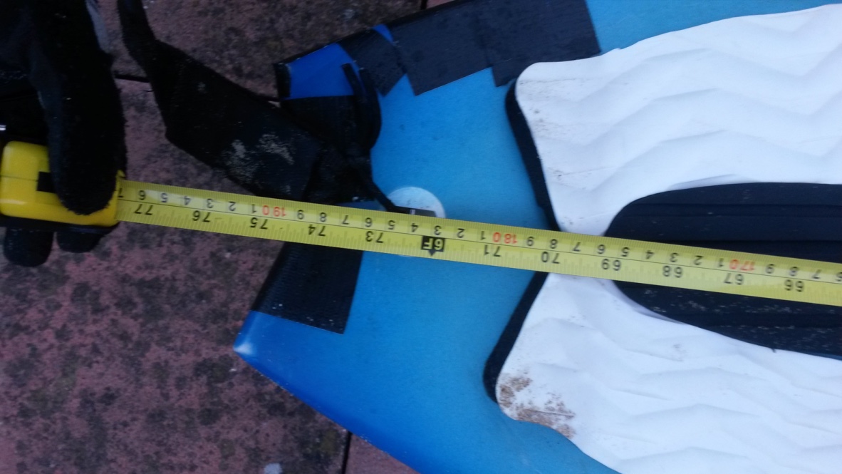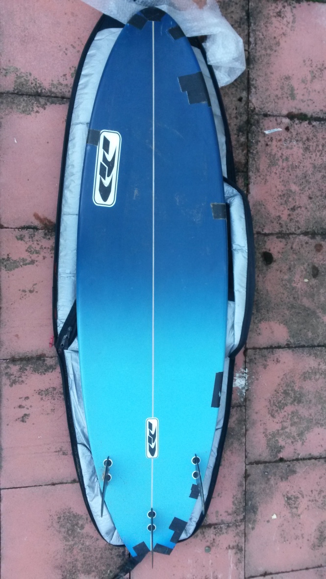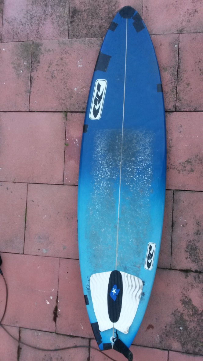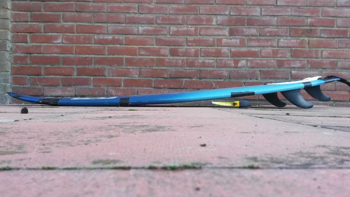 So what I would really like is for you folks who have experience of comparing different types of board to help me figure out what kind of dimensions/shape might work for me. My thruster doesn't have the dimensions marked on it (let alone volume!) but I've done some measuring and included some photos below to give an idea of the shape, rocker etc. I hope the gaffer tape doesn't make you cringe too hard!
