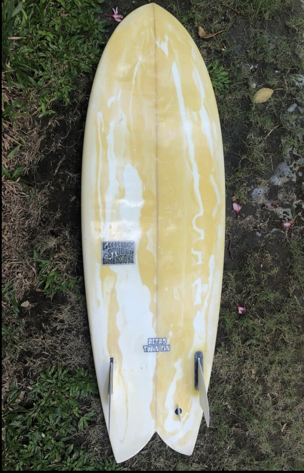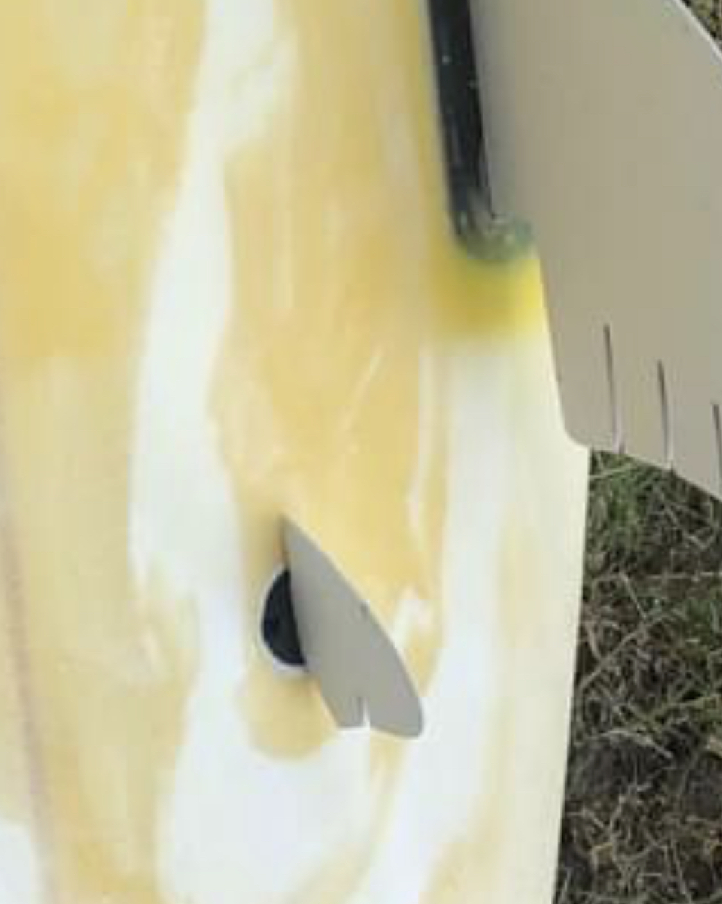 An asymmetrical adapter fin probably a later installation to tweak for a specific break! The cuts in the trailing edge of the bigger fin add trailing edge flex, moderate value, the fish design of the board is very knee board profile influenced.