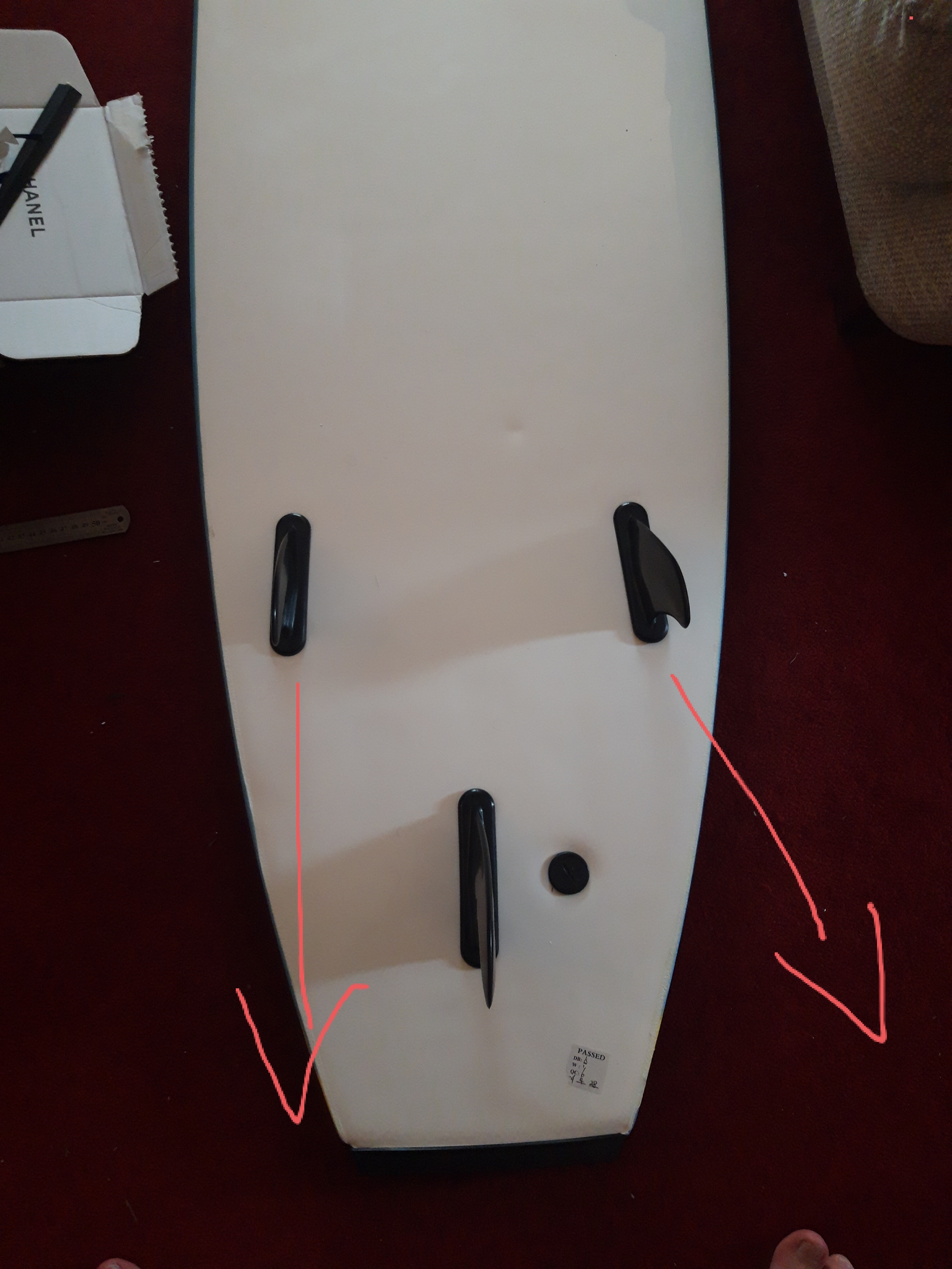 I have bought a new 8 ft foamie board but the left side fin holes have been drilled in at a weird angle so that the fin is wonky, pointing off to the side (see attached pic).