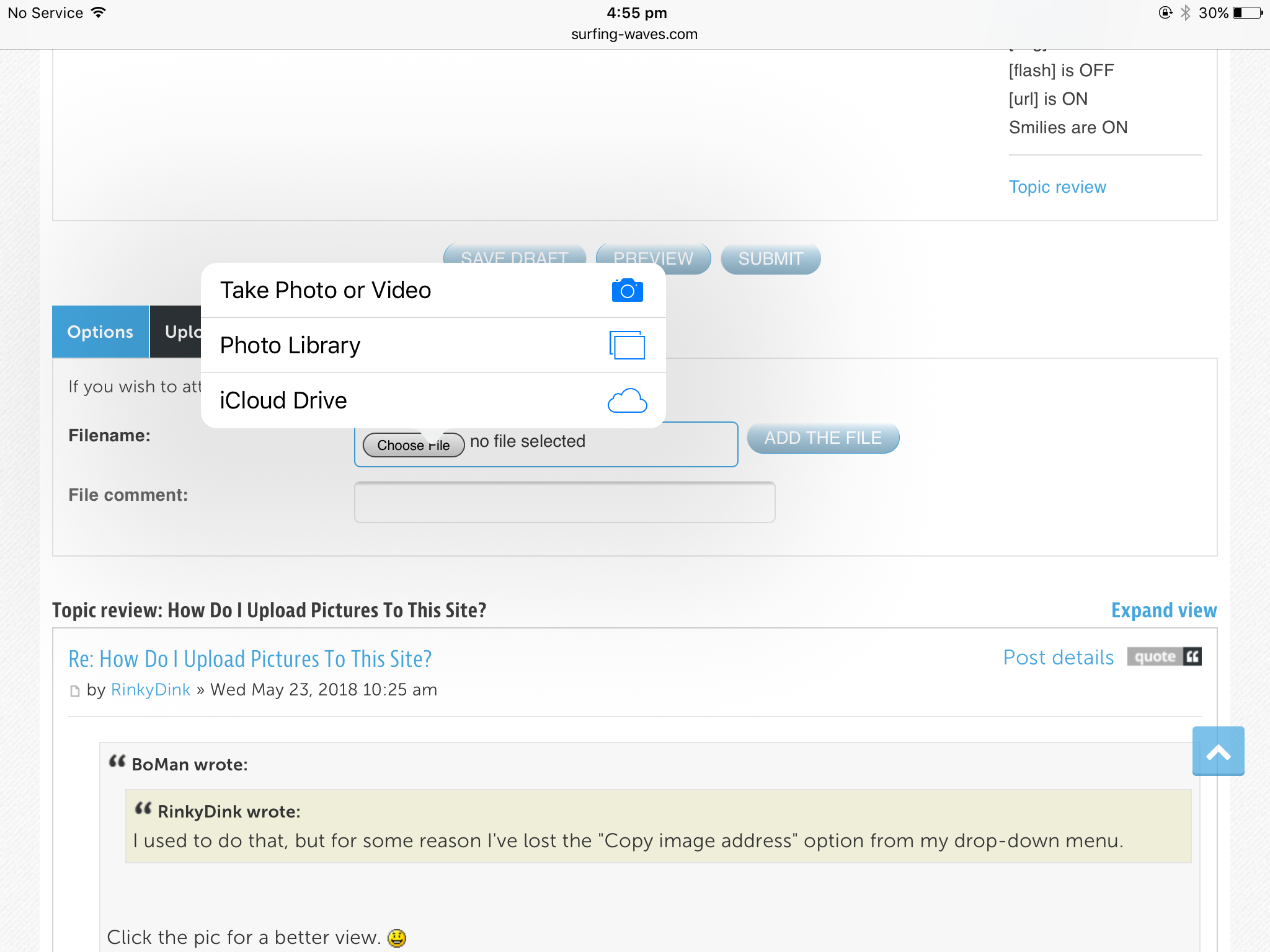 oldmansurfer wrote:You have to use the post reply button or the full editor button. Then go to the bottom and click upload attachment. Then click on chose file which will bring up a menu for your computer go find the picture then click add the file. Then wait it takes a while then it will bring up a labeled picture asking if you want to delete or place in line. First move your cursor to the place you want the file to go (above or below words) then click place in line. then post. You can also do it if you first post it at some photo sharing site on the inernet