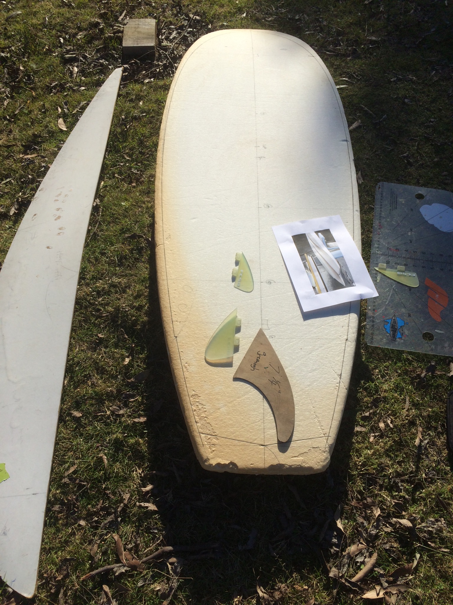 The board could also be a standard short board but it is on the wide side, part of the width will be gained by adding a double stringer the width of the fin box apart, the outer fins will be the FCS Bonzers and can be either the large or small set!