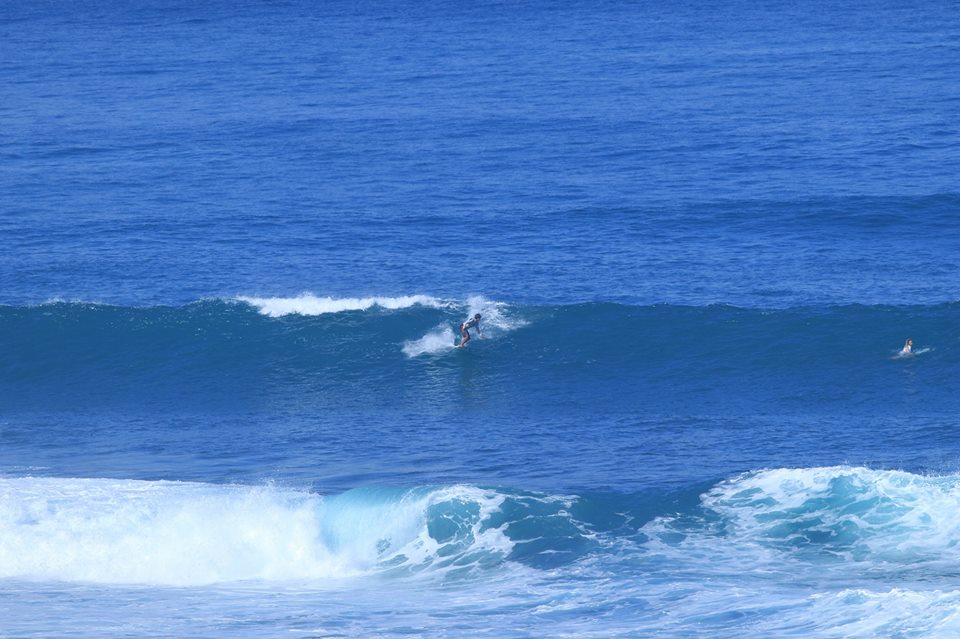 Then the currents picked up......I noticed the crowd thinning but the ripper group that I paddled out with was hanging tough on our peak down from the rest. Keeping up with the sweep slowly evolved from equal parts rest and paddle to hold position to a decent constant effort.....the whole ocean was like paddling in a rip current and the rips showed up like angry rivers in otherwise fairly choppy seas. Ten minutes later and it was just us out there; the rest had called it. I was on my big awesome paddling fungun and was still having to pay attention to my dwindling reserves.....by this time to hold position was an effort for sure......a set came through and I got my best wave of the session - caught it at the peak and rode it out about 200m then lay down and rode on my belly the rest of the way in. I turned around when getting out and the crew I had been with were following suit one by one, all headed for the beach. There was one guy still out there, a pale island newbie on a wide nosed fish who was gamely paddling directly against one of the rips. I walked down and pointed him out to the lifeguard who was already watching closely. I left it with him and looked at what usually was a crowded break with only one person out in that wonky ocean.