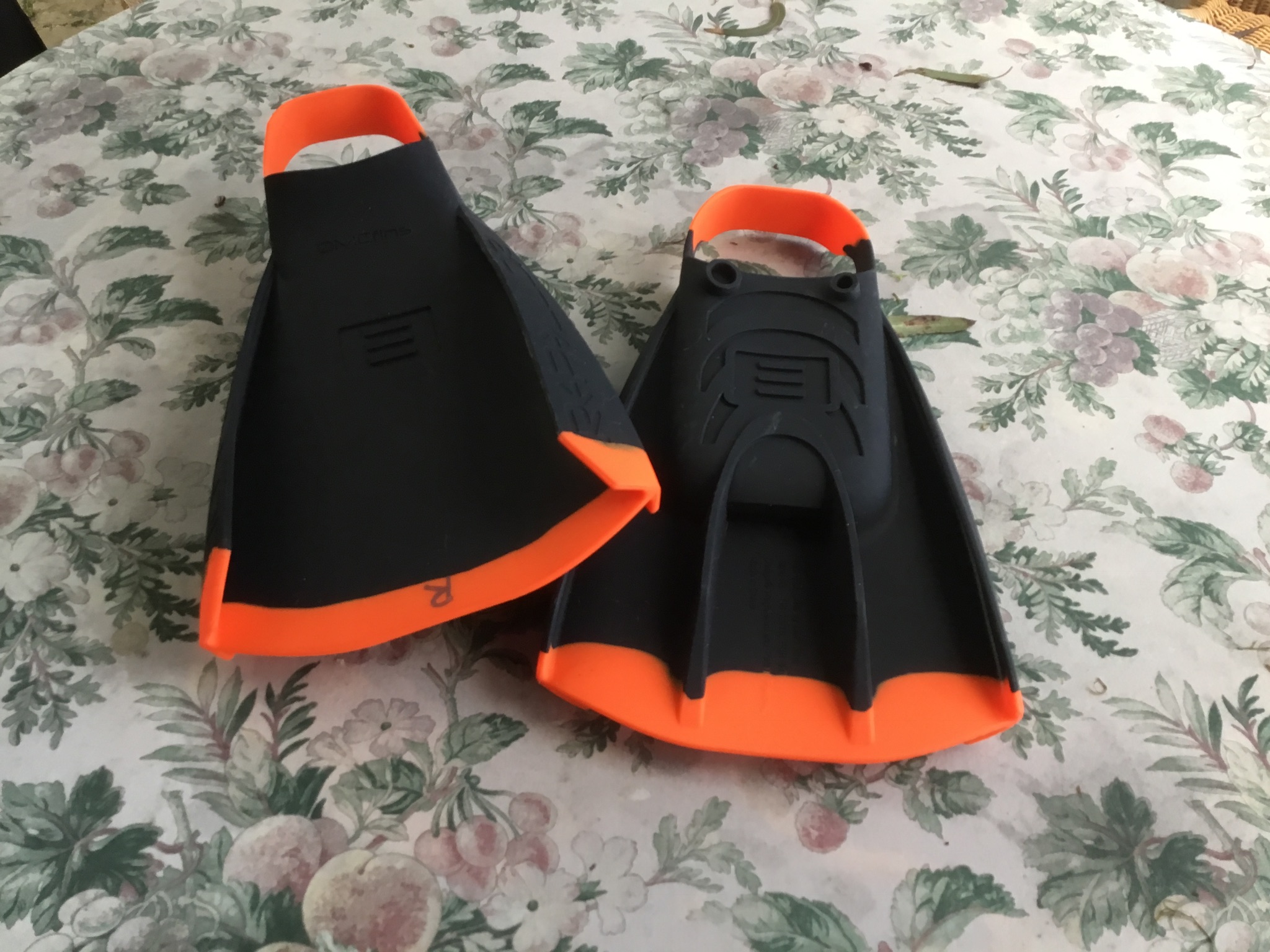 Being the same size, M, they are a bit different, one has a lighter, more vivid orange, has softer rubber, is a bit larger on the foot pocket (about one size larger) and is a tad lighter (680g vs 800g).