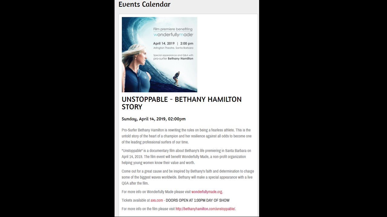 Bethany Hamilton is in Santa Barbara today. She's here to premier her life documentary film, "Unstoppable." . This is one of the promotional clips for the movie: