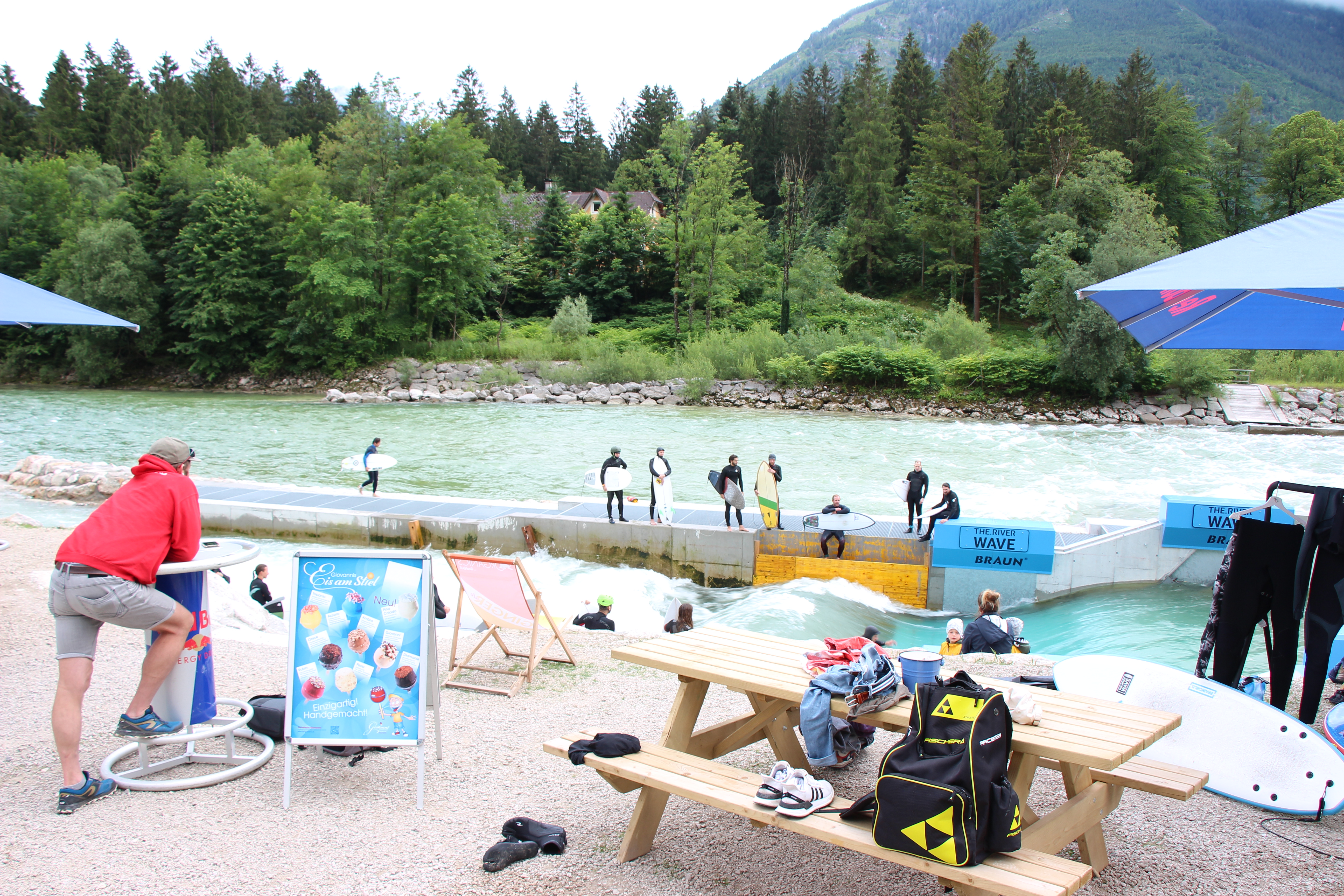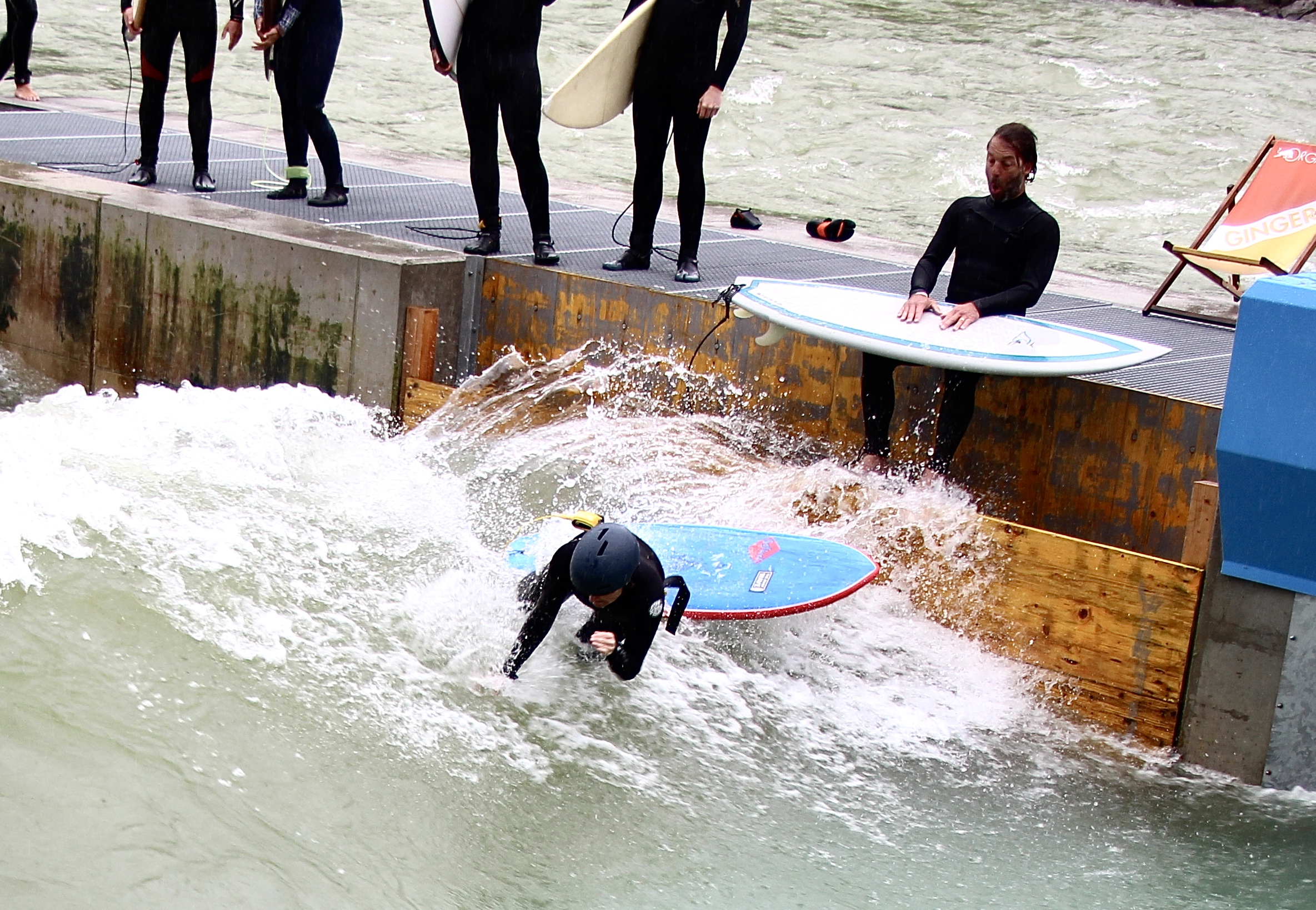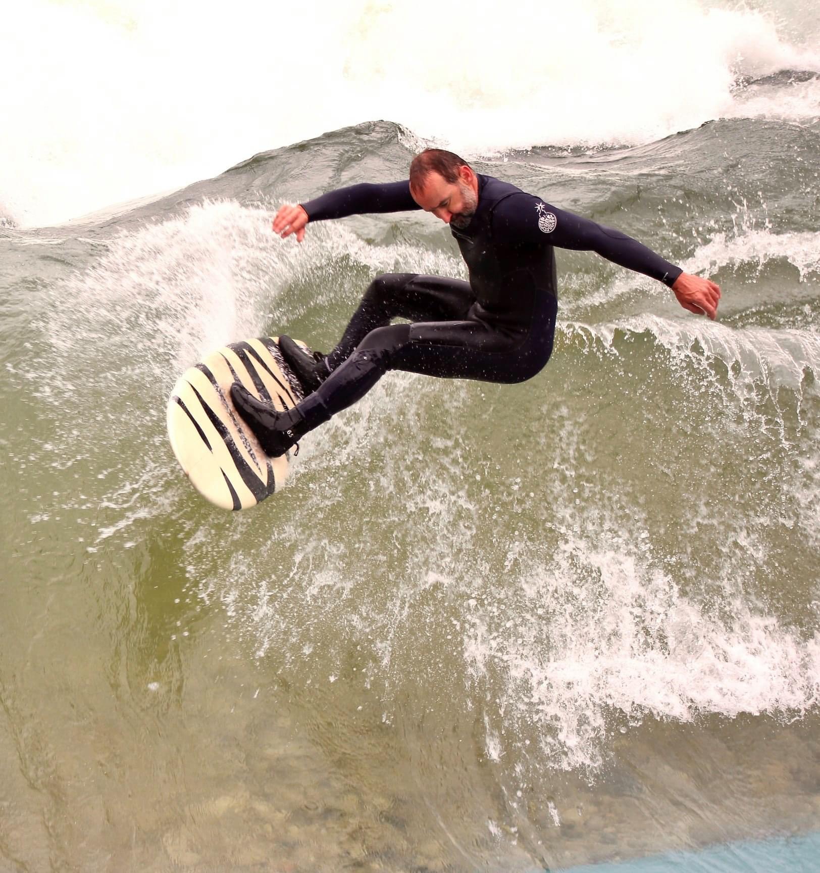 Now to stand up on the River wave..... no paddling no no pop up , just stand and riding, what could go wrong.