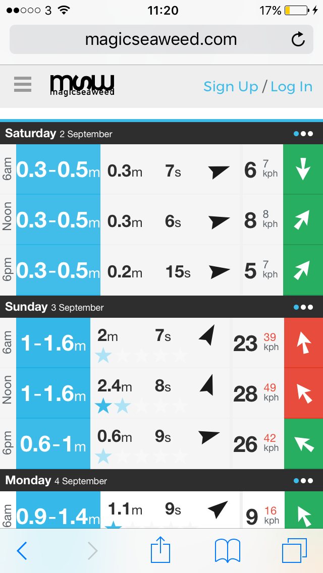 Now consider the Sunday surf conditions, let's start with the swell at biggest 2.4 metres close enough to 8 feet. and giving rise to a 5 to 6 foot wave at the beach. now note the period, not bigger than 9 seconds so each swell is hitting the beach every 9 seconds, so the swell is being generated locally the winds are stronger than Saturday but are side shore until the evening when they turn more offshore , this again shows the conditions and the swell is being generated locally , this is not hurricane swell (for that you would see bigger swell , longer period but winds could be local and light to strong .)
