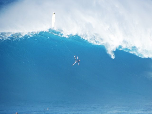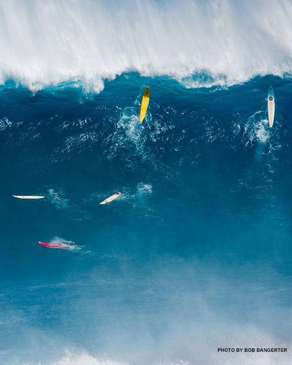 I was looking at big wave riders online and came across a couple photos of empty surfboards on the face of cresting waves at Jaws. At least one of the photos had a rider already halfway down the face. Took me a while to put things together and really didn’t put it all together until I came across a pic of a surfer that fell off at the lip and I saw how long his leash was. Are the surfers just acting as sea anchors with their boards getting pulled through the face?